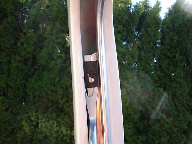 The outer scraper is also different. While the seal is a very good match for the original, the number of notches is different. This probably required more felt channel clips used on the Brazil bus (my guess again) but for us there is a hitch: the lower notch on the side member does not line up with the hole in our door frame. Either, install the outer scraper with one less felt channel clip (not recommended) or create a new notch in the scraper to secure it properly. Since the scraper is made from soft aluminum making a notch is easily done.