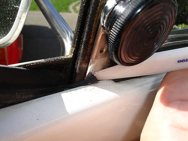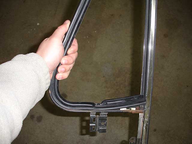 4. At the end of the scraper there is a section of rubber that is wedged between the post of the vent window and the door. If you aren't replacing the inner scraper with a new one, be careful not to tear any rotten rubber there. Use your window tool to put it free. Seal lubricant sometimes helps especially upon re-installation.