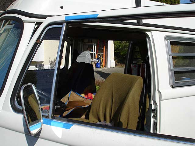 1. To prevent any scratches to the window, apply two strips of blue painters tape to the vertical edges of the window because these parts are the most susceptible to scratching during window removal. You don't have to cover the entire window with paper and I've found if you do the window becomes difficult to insert later. Don't worry about scratches to window parts hidden by the felt channel.