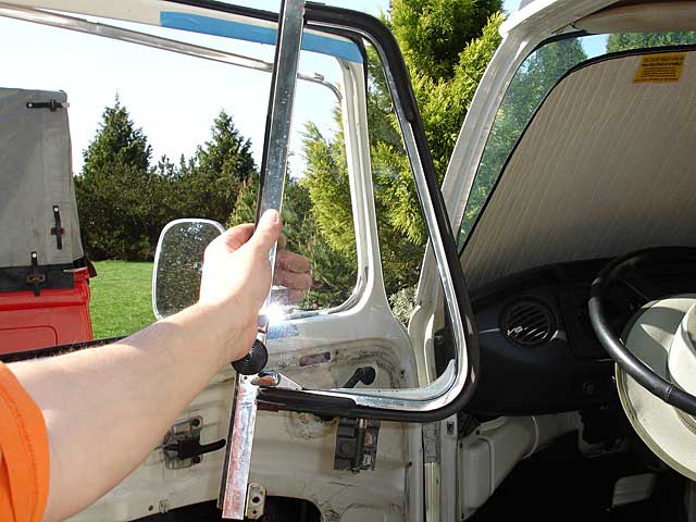 3. With the window half raised, use one hand to hold the window and the other to continue the winding process. With the window near the top you can begin to lean it to the inside and pull it free with both hands. Now go and wash 30+ years of dirt from the lower part that you could never wash before.