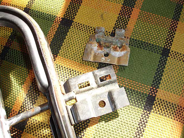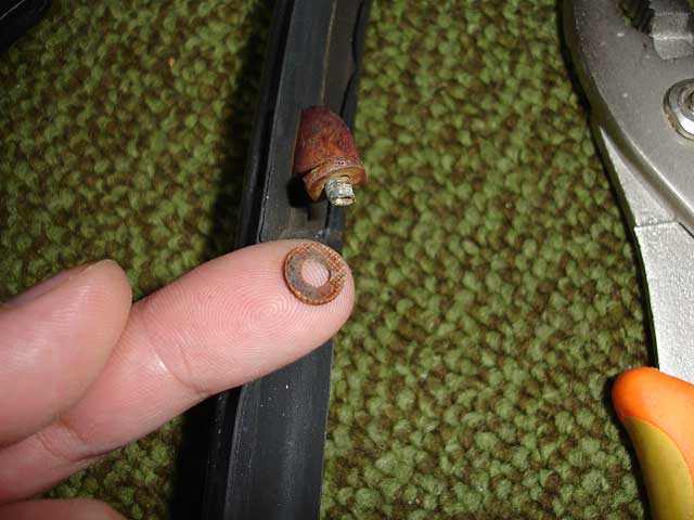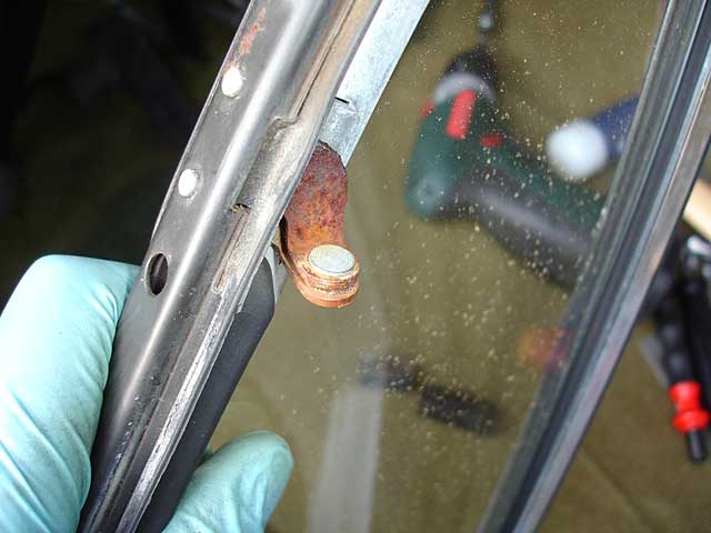 5. With the clamp undone you can pull the quarter-lite from the top by sliding the pivot pin through the opening in the frame. Look at that clamp: there's a good example of the galvanic corrosion that can occur when dissimilar metals touch.