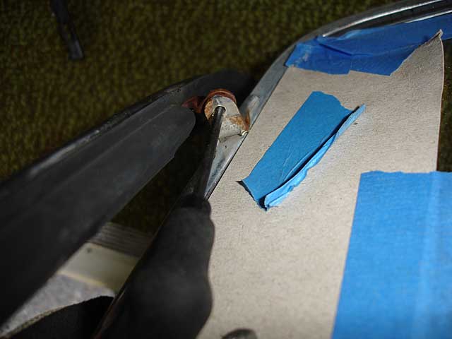 1. Carefully grind off the back of the rivet. You can see that I've protected the glass from accidentally glances from the grinder with a strip of metal sandwiched between two pieces of cardboard. Even so, you need to be very careful with the grinder. A Dremel tool probably will work best in this situation.