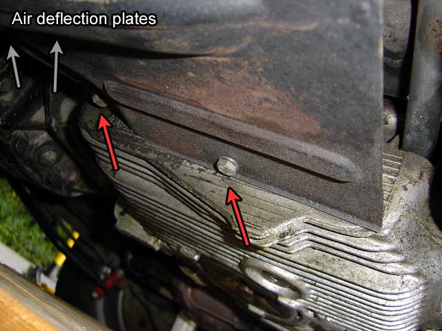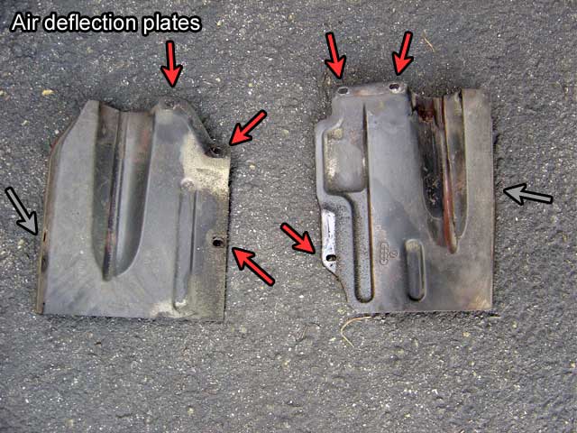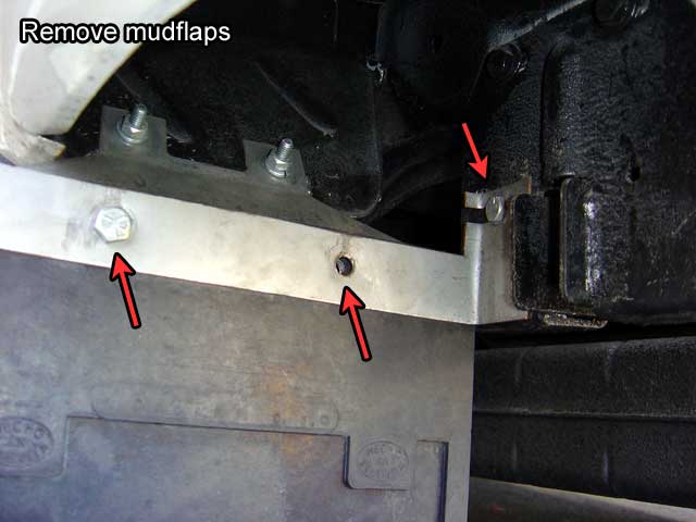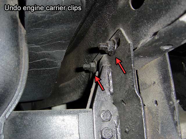| 20.1) We're almost ready to support the engine solely on our jack. If you have mud flaps secured to the engine carrier clips with the original style 2-piece brackets, undo the L-bracket on each side. |