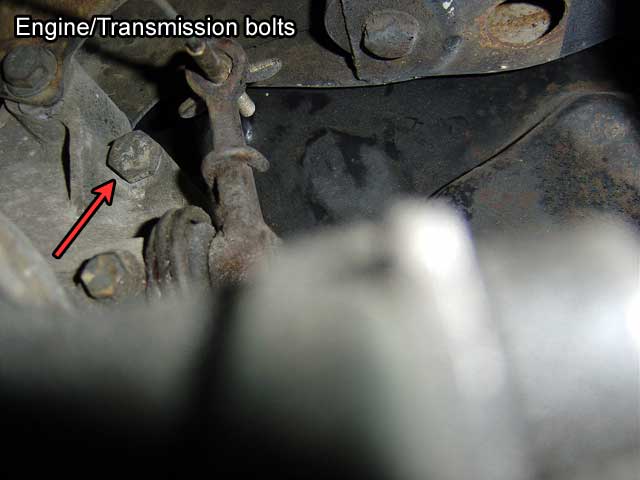 | T.9) With the transmission supports, Use a 15mm socket to move to (2) bolts on the transmission carrier. The nuts are welded to the support so you don't need a 17mm box wrench. When you reinstall these bolts, install the one over the starter first. The second bolt is always harder to thread and if you do the starter one last you won't be able to see what you are doing because it's obscured requiring you to hug the transmission as you blindly fiddle with the bolt. |