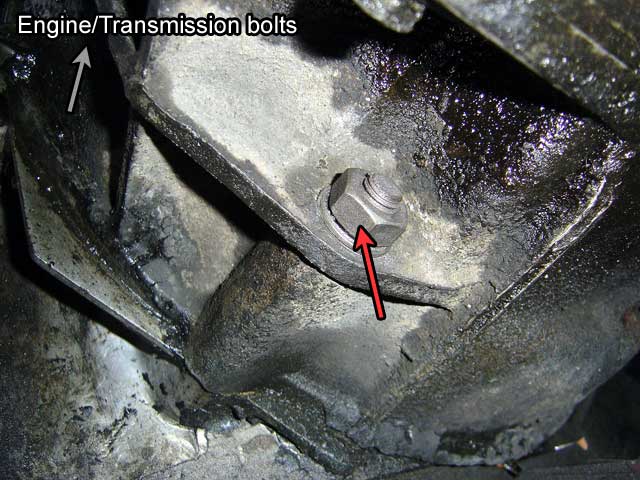 | T.10) Undo the (2) 17mm bolts securing the transmission limiting stop (rectangular block). Don't clean this item: leave the dirt as is so you can use it as a guide for remounting it in exactly the same spot. |