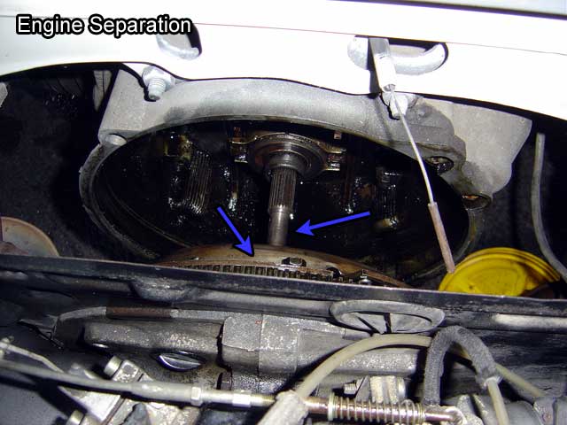 | 20.3) The engine can now be separated from the transmission. This is the hardest part. You have to keep the engine level so you can pull the pressure plate out of the input shaft of the transmission. The input shaft cannot bear the weight of the engine either. Sometimes due to lack of lubrication during installation, the input shaft can stick. Finally the oil filler tube gets in the way during removal so you have to play some tricks with the height of the bus and the engine. Goto to transmission removal steps and return here afterward. |