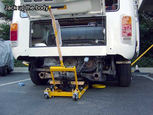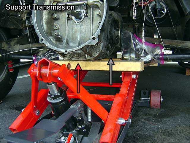 | T.8) Support the transmission to prepare for the drop. I like to use an ATV jack but you can use any floor jack. |
