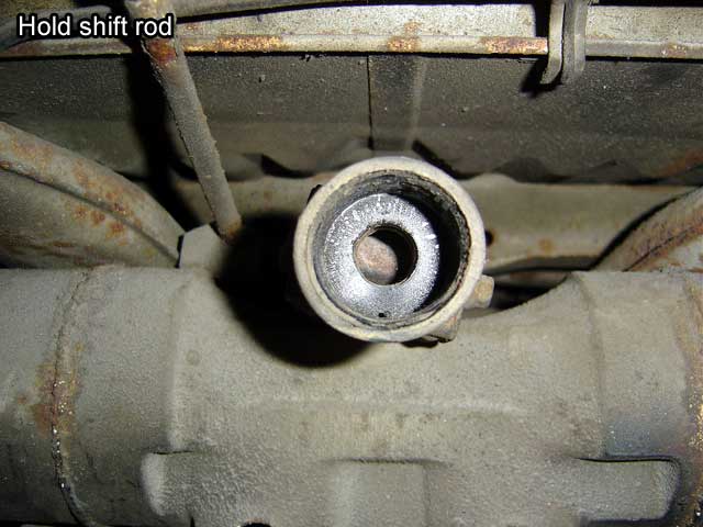 | T.11) You are now ready for removal. Grab the shift rod and pull it off the shift lever or hold in it place while the transmission is pulled back. Depending on your jack or dolly you might not clear the rear valence. Since the transmission weights so little, just lower it onto something to clear the rear valence rather than jack up the bus. |