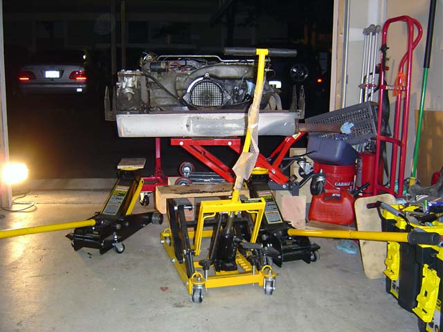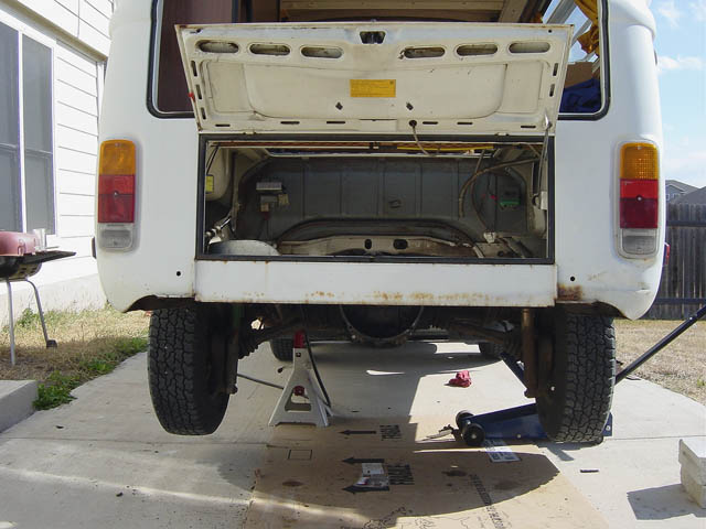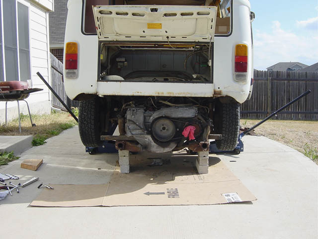 When pulling the engine, you'll need at least two jack stands and one floor jack. However two floor jacks are better than one for raising the back end of the bus without the risk of the bus falling off one jack stand because you have to raise the apron of bus about 22 inches off the ground for the engine to clear the body.