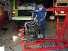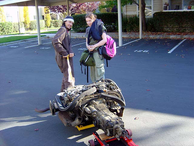 Here's a photo essay of my first engine pull using concrete bricks and a small piece of plywood. Note that supporting the engine by the heater boxes is not good for them.