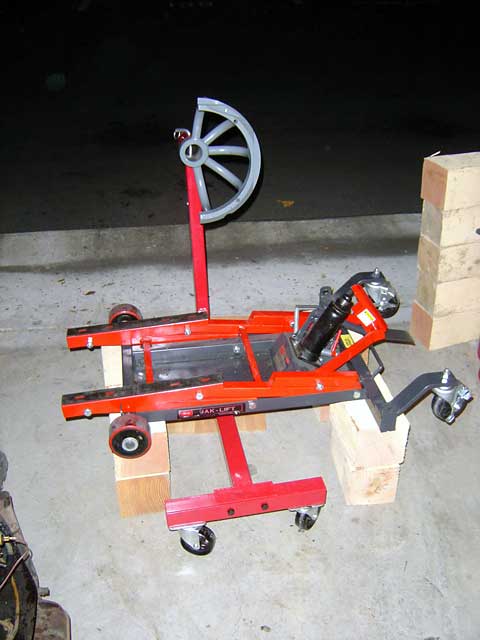 This commonly found dolly is made from metal (although I've seen a few home-made versions using 2x4's) and it lets you slide a jack between the legs so you can lower the engine onto it and remove the jack afterwards. Some models have 4 casters instead of 3 and most are most from angle iron although I've seen a couple made from stronger T-iron.
