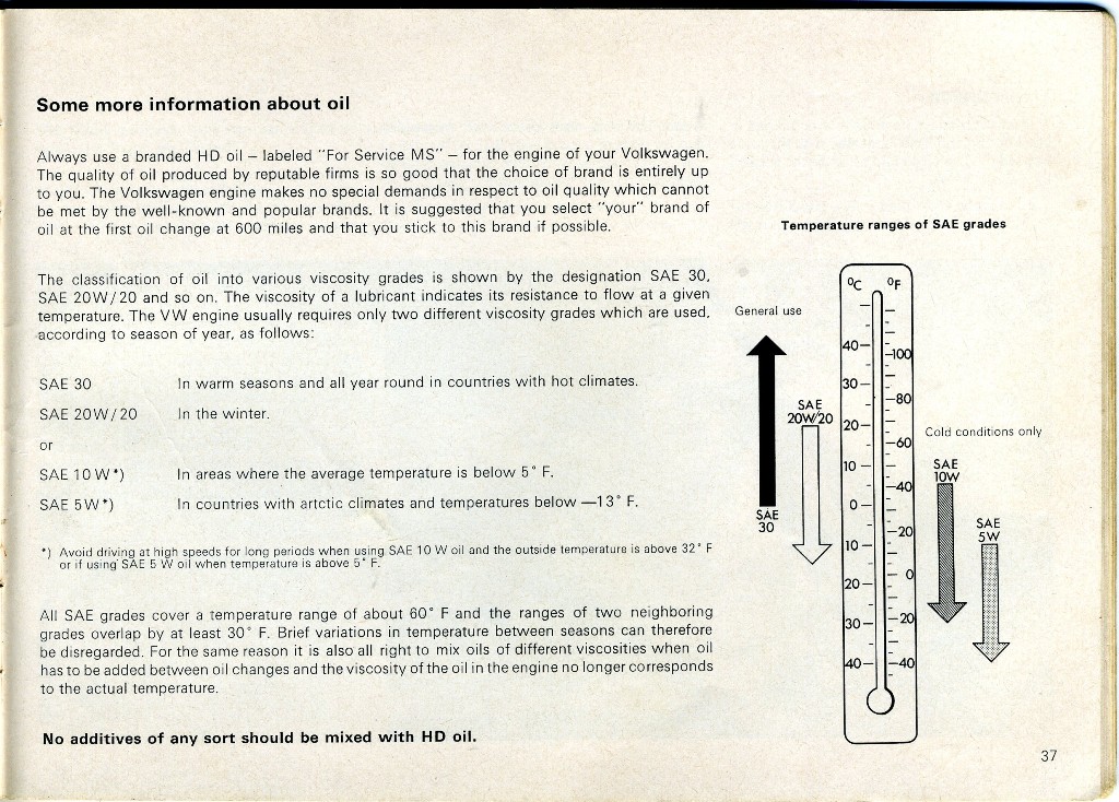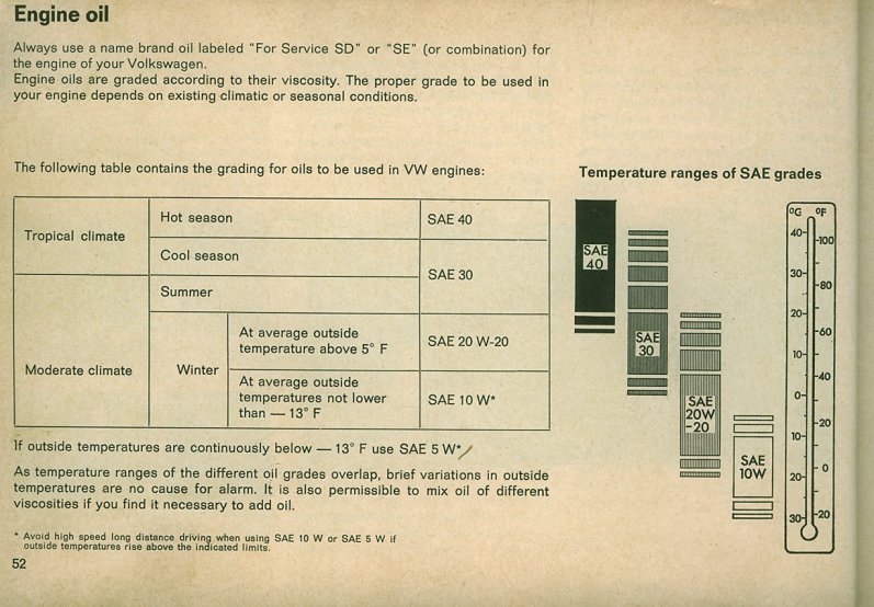 Eventually the oil companies formulated them into the reliable products we use today and by the mid-70's, VW had published an engine oil viscosity specification chart that superseded all prior advice on oil selection. They recommended several multi-grade oils along with traditional single-grade oils so what's the difference?