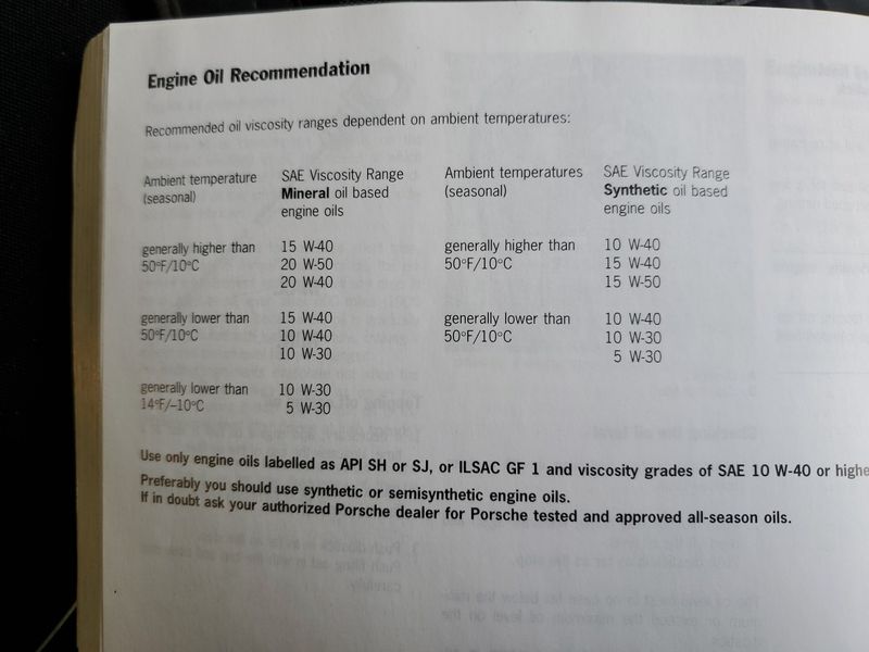 I've written another article devoted to synthetic oils but it's worth mentioning here that Porsche produced a set of guidelines for their 968 that demonstrates their approval of thinner grades of synthetic oil, notably with lower (W)inter numbers than conventional (mineral) oils. For example: